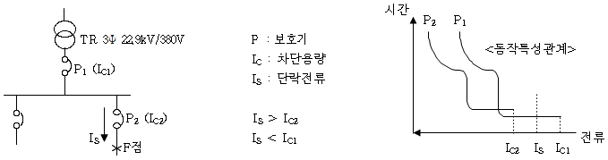 조건 2)는 전류치와 함께 그 통과시간이 짧을수록 협조가 얻기 쉽다는 것을 나타내고 전원측 차단기는 고속차단이 요구된다.