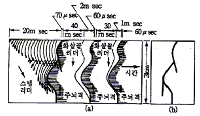 뇌운 속에서 전하 축적에 따라 그 바로 아래 지표면에는 운저(雲底)전하와 역극성 전하가 유기되므로 양자간 전계 강도가 증대하여 공기 절연 파괴 내력을 넘으면 양자 사이에 불꽃 방전이 발생하고 이른바 대지 뇌격(낙뢰)이 일어난다. 피뢰설비상 관계가 있는 것은 대지 뇌격이다. 여기서는 이들에 대하여 지금까지 명확하게 밝혀진 주요 특성을 기술한다. 1930년대 남아프리카에 있어서 Schonland(영), Malan(영), Collens(영), Hodges(영) 등이 보이스카메라(회전카메라)로 대지 뇌격 과정을 관측한 결과 낙뢰 진전 과정과 같이 진전되는것이 분명해졌다. 그림 (a)는 보이스카메라에 의한 것으로 시간에 따라 좌에서 우로 전하고 있다. (b)는 이것을 정지 카메라로 촬영한 것이다. 각 뇌격은 우선 구름에서 빛이 약한 선행 방전(선구방전)이 발생하고 그것이 대지로 행하여 전진하고 그 선단이 대지에 접근하였을 때 대지 쪽에서 상향의 스트리머가 출발하고 양자가 결합하는 순간 대지로부터 다량 전하가 선행 방전에 주입되어 이른바 주뇌격(주방전, 귀환 뇌격)으로 된다. 처음에 뇌운으로부터 대지로 향하는 선행 방전은 단계적으로 진전한다. 이것을 보통 스텝 리더(계단형 선행 방전)라 한다. 일반적으로 이 스텝리더는 음과 양 사이에 두 역내에서 국부적인 절연 파괴로부터 시작된다. 스텝 리더는 50[m]정도 진전하면 약 50[㎲] 휴지(休止)하는 과정을 반복하면서 차츰 대지에 접근한다. 구름과 대지 사이에 스텝 리더 평균 진전 속도는 약 1.5×105[m/s]이다. 따라서 진전거리가 3[km]이면 약 20[ms]가 필요하다. 이 선행 방전로에 주입되는 것이 평균적으로 보면 약 5쿨롱[C]이다. 이것이 10[ms]시간 안에 주입된다고 하면 흐르는 전류는 대체로 500[A] 범위가 된다. 스텝 리더 지름은 대체로 1~10[㎝]이다. 이 경우 스텝 리더 전류는 중심부에 가는 도전성 코어 속을 흐르는 그 주위 부분은 코로나시스라고 생각되어지고 있다. 이상과 같이 스텝 리더가 대지로 접근하면 리더 위 전하에 의하여 지상 전계는 상승한다. 대지 쪽 여러점에서 리더 선단을 향하여 상향 방전이 발생하기에 충분한 값이 된다. 상향 스티리머 하나가 스텝 리더 선단과 결합하면 리더 선단 부근은 실효적으로 대지 전위로 접속되고, 나머지의 선행 방전로는 음으로 대전(음전위)된다. 선행 방전로는 빛남이 강한 주뇌격을 통과시키는 전송로로써 작용한다. 주뇌격 파두 즉 고전계 강도에 이온화된 파두는 스텝 리더에 의하여 개척된 방전로를 상향으로 반전한다. 주뇌격 파두에 전반속도는 광속에 약 1/3~1/10이다. 따라서 전반 시간은 수십[㎲]정도다. 주뇌격의 파두와 대지 사이에는 대전류가 흐르고, 선행 방전로 위에 분포한 음전하는 주뇌격 아래쪽 고도전성 방전로를 통하여 실효적으로 대지 방향으로 하강한다. 대지에서 측정한 전류의 대표적인 것을 보면 수[㎲]사이 10~20[kA]에 달하고 20~60[㎲]사이에 파두가 1/2로 저하한다. 다시 그 뒤 100[A]정도에 전류가 수[ms] 계속하는 수가 있다. 이상으로 1회 뇌격이 종료하지만, 다시 구름 속에서 선행 방전로 정상에 전하가 공급되면 계속해서 제2의 뇌격이 발생한다. 이러한 뇌격을 다중 뇌격이라고 한다. 일반적으로 이러한 전하는 뇌격과 뇌격사이에 공급된다. 만약 전하공급이 주뇌격 종료후 약 100[m/s]이내에 행하여지면 화살꼴 리더가 앞 우뢰 방전로를 통하여 대지로 진전하고 이것이 대지에 도달하면 다시 제2의 주뇌격이 대지 쪽에서 발생한다. 이 경우 리더는 계단상으로 되지 않고 그 평균 진전 속도는 약 2×106[m/s]이다. 낙뢰의 진전과정에서 그 상황이 표시되어 있다. 전뇌격 약 50[%]는 다중 뇌격이며, 그 중 다중 회수(스트로크의 수) 2~4인 것이 대부분이고 경우에 따라서는 26에 이르는 수도 있다. 피뢰설비를 생각하는 경우 특히 중요한 것은 뇌격 전류의 파고값, 다중 뇌격 스트로크수, 뇌방전 지속시간 등인데 이것들은 전격마다 대폭으로 변한다. 피뢰설비로서는 모든 뇌격에 대하여 100[%]의 보호 효과를 발휘하는 것이 이상적이기는 하지만, 그러한 설비를 하는 것이 경제적으로 곤란한 경우도 있다. 이러한 때에는 보호대상물에 중요도, 그 지역의 뇌의 세기 등을 고려하여 안전하고 경제적인 피뢰 대책을 강구할 필요가 있다.