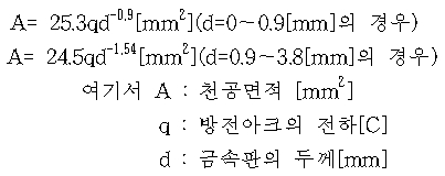 재료의 종류 및 두께에 따라 차이가 있다고 생각되지만, 통전후 50[m]에 약 300[℃]의 온도상승에 달하고 있는 것을 알 수 있다. 일본에서도 인공 뇌전류(16~61[kA], 1×10-3[s])를 0.5~1[mm]의 알루미늄판 및 스테인레스판에 통전하고 손상 정도를 관찰하는 실험을 했다. 봉전극과 평판이 접촉하고 있으면 알루미늄 판에서 수 [mm]정도 구멍이 뚫리지만 두 전극이 떨어져 있으면 녹은 흔적이 조금 생길 정도이고 구멍이 뚫리는 일은 없었다.