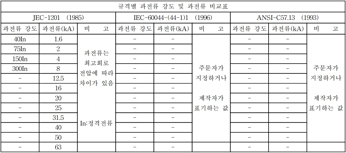 변류기의 과전류 강도는 단락사고 시 단락전류에 변류기가 견딜 수 있도록 선정해야 될 것이다.