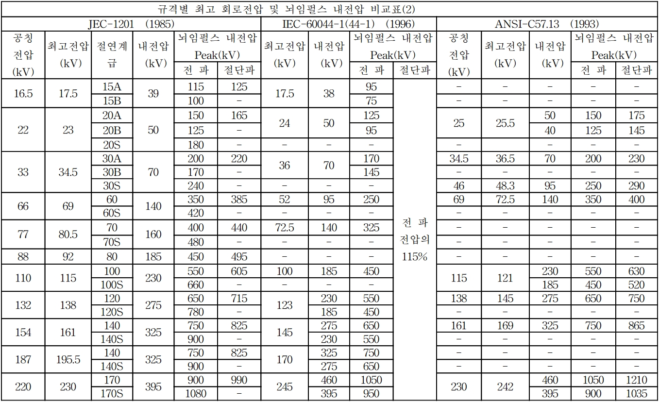 최고 회로전압이란 변류기가 실제로 사용되는 전기선로의 공칭전압과 절연내전압 및 뇌임펄스내전압(BIL)을 의미하며