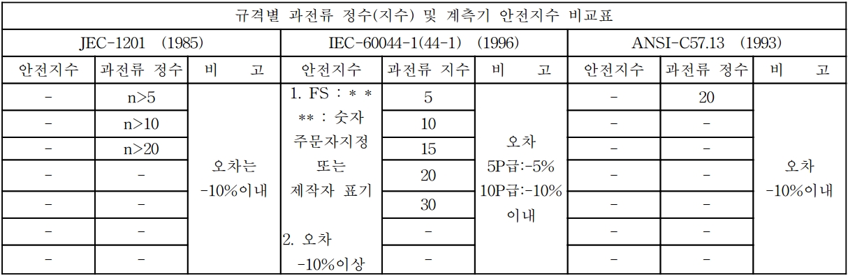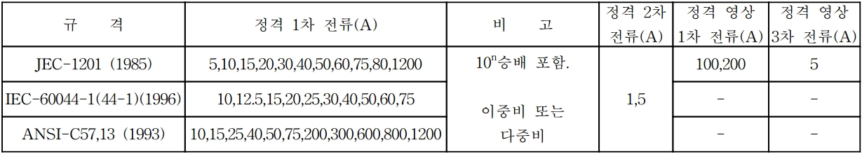 계측기용과 계전기용에 따라 규격별로 다음과 같다.