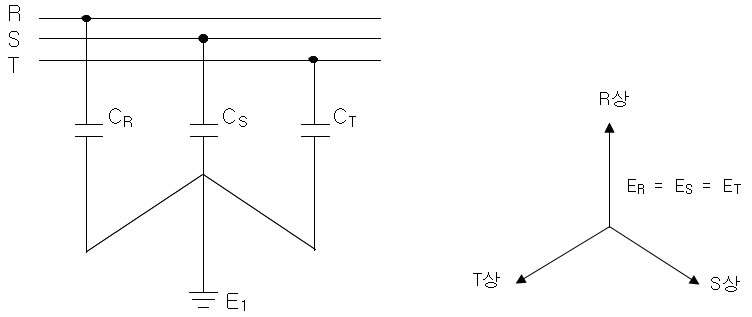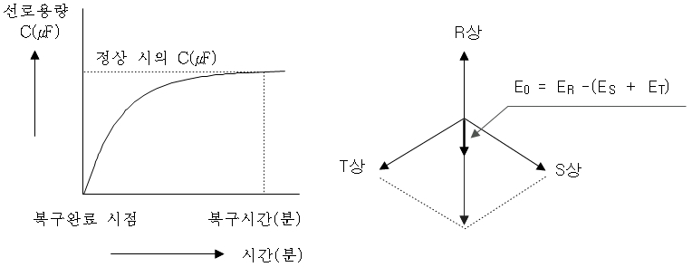 이는 선로 각상과 대지간의 절연이 공기 및 케이블절연체이기 때문에 R상이 지락이 되면 R상의 대지정전용량C(㎌)가 바로 0(㎌)이 되었다가 지락사고가 제거되거나 지락이 원상복구 되면 R상의 대지정전용량이 바로 원상복구가 되는 것이 아니고 수 분 동안에 거처 원상태로 되기 때문이다.