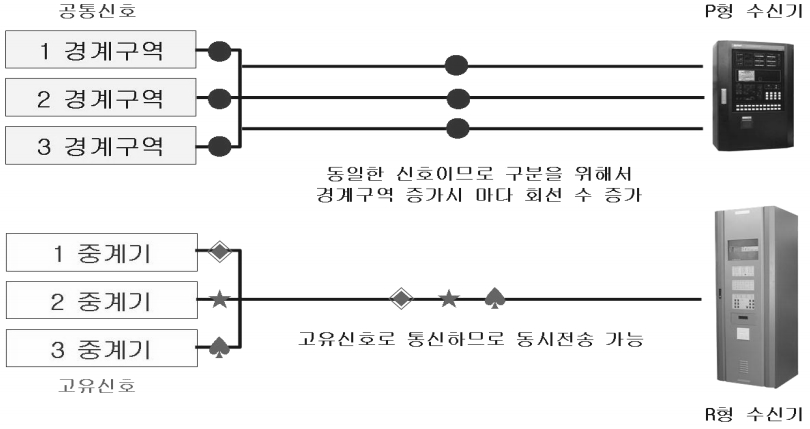 자동화재탐지설비는 신호전송방식에 따라 공통신호방식인 P형과 고유신호방식인 R형으로 구분할 수 있다.
