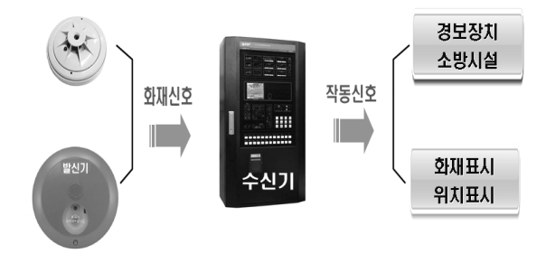 자동화재탐지설비는 이러한 필요성에 따라 화재발생을 조기에 경보하고 화재위치를 통보하는 기능을 하는 설비로 화재가 발생하면 자동으로 화재발생신호를 발신하는 감지기, 사람이 수동으로 화재발생신호를 보낼 수 있는 발신기, 화재발생신호를 수신하여 화재위치를 표시하고 경보장치 등에 작동신호를 발신하는 수신기, 화재가 발생했음을 경보해 주는 음향장치 및 시각경보기(이하 “경보장치”라 함)로 구성되어 있다.