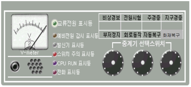 자동화재탐지설비와 관련된 표시등과 스위치를 설명하면 다음과 같다. 교류전원등, 스위치주의등, 전원이상등, 복구, 주음향정지, 지구음향정지, 예비전원시험스위치는 P형과 동일한 기능을 한다. 전화번호판처럼 보이는 TEN-KEY스위치는 회로의 선택 및 제어에 사용되는 스위치이다. 동작시험시 회로선택을 번호를 눌러 입력하고 단말발보스위치를 누르면 해당회로를 동작시험 할 수 있다.
