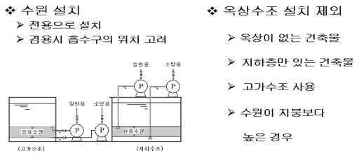 ◦ 수조는 소방설비의 전용수조로 하여야 하나, 보통 일반급수용 수조와 겸용가능하며 ,