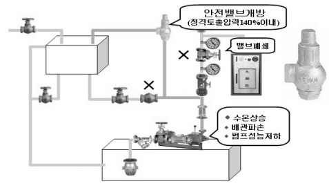 펌프가 정상적으로 회전한 상태에서 토출측에 물이 방출되지 않으면 체절운전 상태에 들어간다. 이때에 펌프내에서는 물과 임펠러의 마찰로 수온이 상승하며, 기포가 발생하고, 과압발생으로 배관파손의 영향을 줄 수도 있다. 따라서 가압송수장치의 체절운전시 수온의 상승을 방지하기 위하여 체크밸브와 펌프사이에 20㎜이상의 분기배관을 설치하여 체절압력 미만에서 개방되는 릴리프밸브를 설치하여야 한다. 체절압력이란 물이 토출되지 않은 상태에서 펌프의 최대 상승압력을 말하며, 화재안전기준에서 체절압력은 정격토출압력의 140%를 초과하지 아니하도록 규정하고 있다.