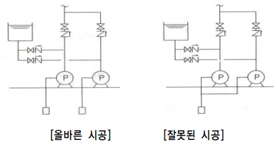 만약 하나의 흡수배관에 주펌프 및 충압펌프를 공용으로 연결하여 설치하게 되면 주펌프 또는 충압펌프의 기동시 물올림탱크 내 물을 흡입하게 되며 , 물올림탱크 내 물이 모두 없어지면 결국에는 공기를 흡입하게 되어 흡수에 장애가 발생할 우려가 있다.