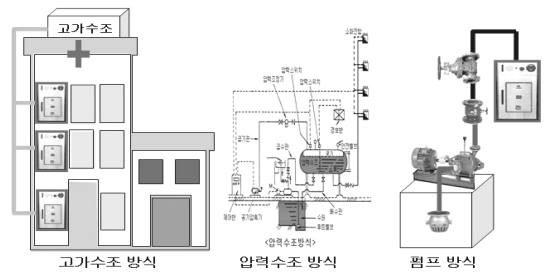 압력수조는 압력탱크에 물을 저장하고, 자동에어콤프레셔로 탱크를 가압하여 압력수를 공급하는 방식을 말한다.
