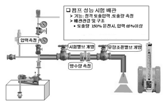 일반급수펌프의 경우 운전점이 하나이기 때문에 압력계 확인 등으로 펌프의 성능을 확인할 수 있으나 소화펌프의 경우 운전점이 다르기 때문에 성능배관을 통해 확인할 필요가 있다. 성능시험은 유량이 0일 경우, 정격토출양정의 140%를 초과하지 아니하고, 정격토출량의 150%일 경우, 정격토출 양정의 65%이상이 되어야 한다.