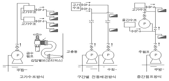 구간을 저층부와 고층부로 구분한 후 고층부용 중간펌프 및 수조를 별도로 설치하여 감압하는 방식이다. 분할 구역방식으로 부분적인 유지관리가 적합하나, 소화장비등의 설치장소가 넓은 공간이 필요하며, 감시 및 제어에 필요한 기기가 커지게 된다.