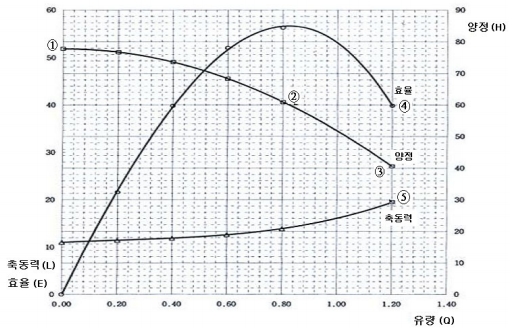 ⑤ 축동력 : 유량이 “0”일 때도 10%의 동력 필요, 이때의 동력에너지는 대부분 열에너지로 소모됨