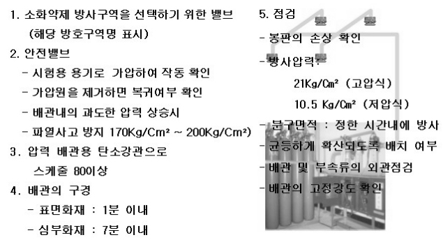저장용기개방밸브는 동관이음이 적절하여야 하고, 수동조작을 위한 Push버튼에 안전클립이 정상적으로 봉인되어 있는지 확인한다.