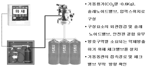 기동장치의 기본 구성품인 기동용기, 솔레노이드밸브, 압력스위치 단자가 모두 적절히 구비되어 있으며, 연결부위는 적절한지 확인한다. 기동용기는 봉판이 뚫려져 있지 않아야 하며 , 솔레노이드밸브를 분리하여 봉판을 눈으로 확인한다. 솔레노이드밸브의 정상작동상태 유지를 확인하며, 다음과 같은 방법으로 잘못 유지되므로 살펴본다.