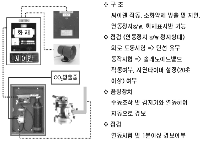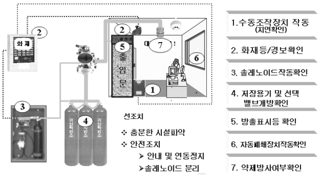 이산화탄소설비는 화재가 발생하였을 경우 정상적으로 약제를 방출하고, 경보를 울리며 , 화재표시등을 점등시키는 기능을 확인하는 방법으로 높은 수준의 주의가 필요하고 안전하게 수행해야 한다. 점검전 사전조치를 취하면 큰 무리 없이 안전하게 점검할 수 있다. 설비의 기능점검순서와 복구방법은 다음과 같다.