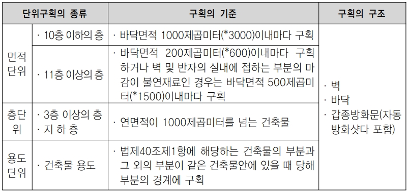 2) 건축물의 화재시 연소확대 경로를 차단하여 피해를 최소로 하기 위한 방법으로 방화구획은 그 효과가 매우 크다. 가장 효과적인 방화구획은 건축물내의 각실이나 점포별로 구획하는 것이겠지만, 경제적인 부담이나 건물이용의 효용성 등을 감안하여 면적별구획과 층별구획 그리고 용도별구획 등으로 그 기준을 정하여 놓았다.