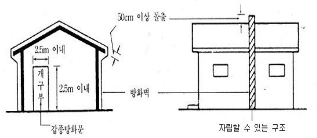 · 방화벽 양쪽 끝과 윗쪽 끝을 건축물의 외벽면 및 지붕면으로 부터 0.5미터 이상 튀어나오게 할 것 · 방화벽에 설치하는 출입문의 너비 및 높이는 각각 2.5미터 이하로 하고 , 해당 출입문에 갑종방화문을 설치 할 것 |