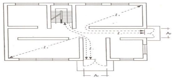 거실의 각 부분으로부터 피난층으로 통하는 직통계단의 하나에 이르는 통과거리로서 실제로 보행하게 되는 최단거리를 말하는 것으로 수평거리와 구분된다.
