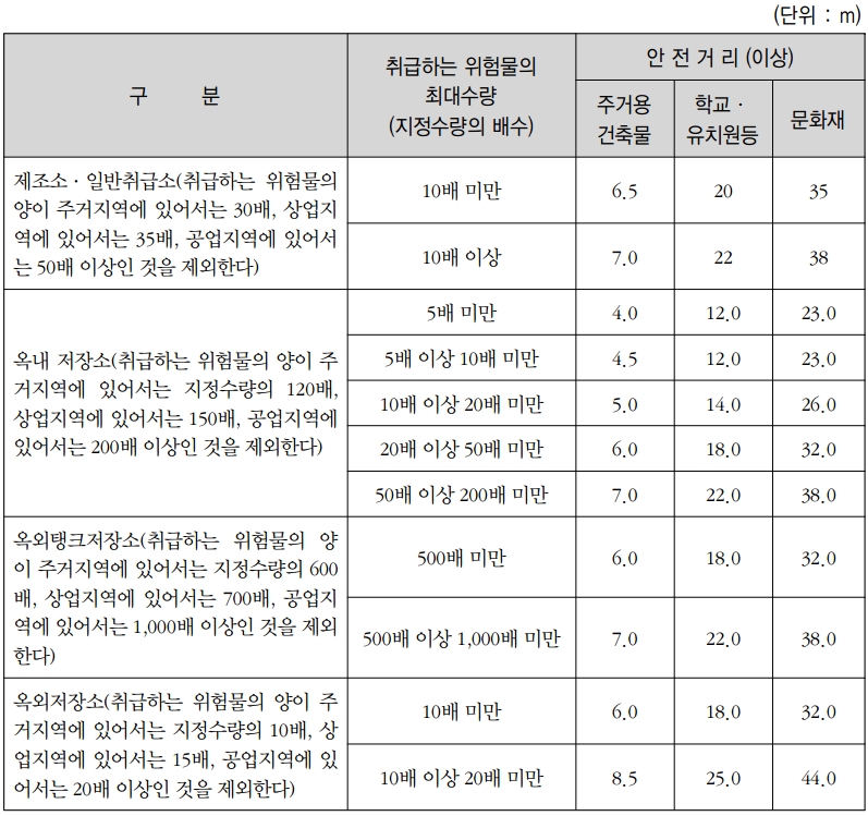 안전거리의 규제를 받는 위험물제조소는 다음의 규정에 의한 안전거리를 확보하여야 한다.