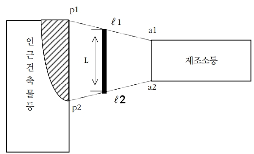 방화상 유효한 담의 길이는 제조소등의 외벽의 양단(a1, a2) 을 중심으로 안전거리의 규제대상이 되는 인근 건축물 또는 공작물 ("인근 건축물등" 이라 함) 에 따른 안전거리를 반지름으로 한 원을 그려서 당해 원의 내부에 들어오는 인근 건축물 등의 부분 중 최외측 양단(p1, p2) 을 구한 다음 a1과p1 을 연결한 선분(ℓ1)과 a2와 p2를 연결한 선분(ℓ2) 상호간의 간격(L) 으로 한다.
