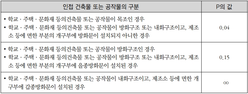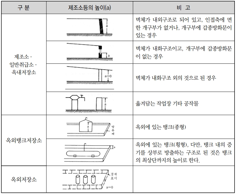 < 표01. 방화상 유효한 담을 설치한 경우의 안전거리 >