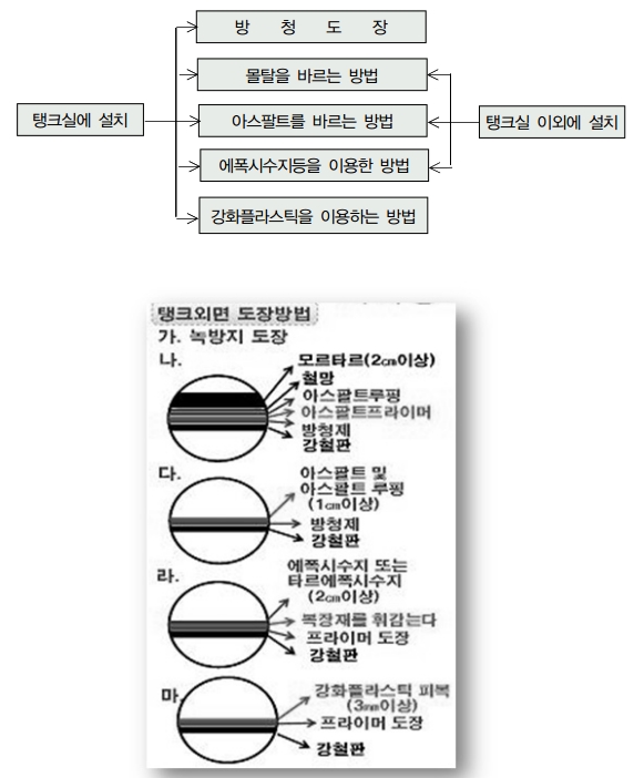 지하저장탱크는 땅속에 매설하기 때문에 부식의 우려가 매우 높다 따라서 부식을 방지하기 위해 다음과 같은 보호조치를 하여야 한다. 다만, 탱크의 재질이 부식이 우려가 없는 스테인레스 강판 등인 경우에는 방청도장을 생략할 수 있다.