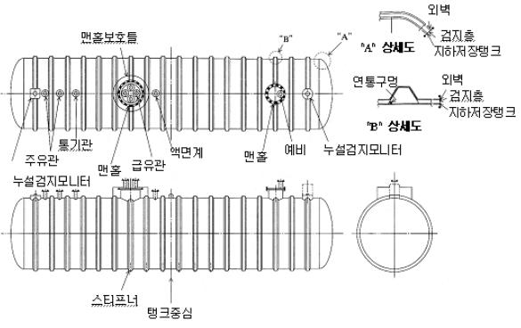 지하저장탱크의 저부에서 위험물의 최고 액면을 초과하는 부분까지의 외측에 두께 3mm이상의 유리섬유 등을 강화재로 한 강화플라스틱을 미소한 간극(0.1mm정도)을 갖도록 피복한다. 지하저장탱크에 피복된 강화플라스틱과 당해 지하저장탱크의 간극 내에 누설된 위험물을 검지할 수 있는 설비를 설치한다.