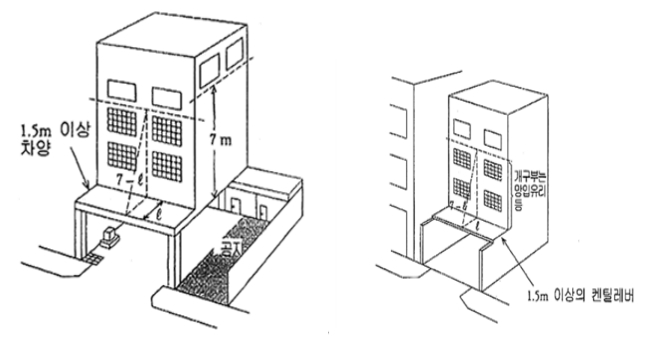 ② 캔틸레버 선단과 윗층의 개구부(열지 못하게 만든 방화문과 연소방지상 필요한 조치를 한 것을 제외)까지의 사이에는 7m에서 당해 켄틸레버의 내어 붙인 거리를 뺀 길이 이상의 거리를 보유할 것.