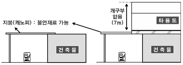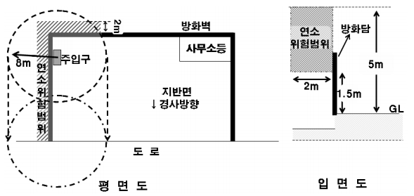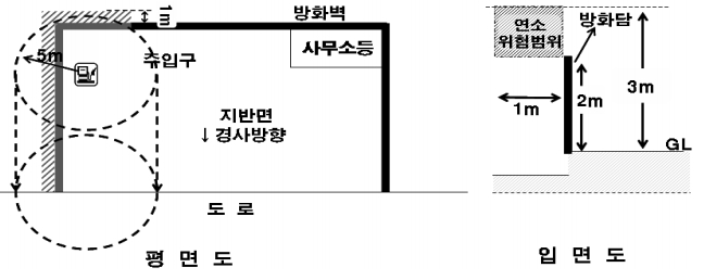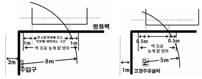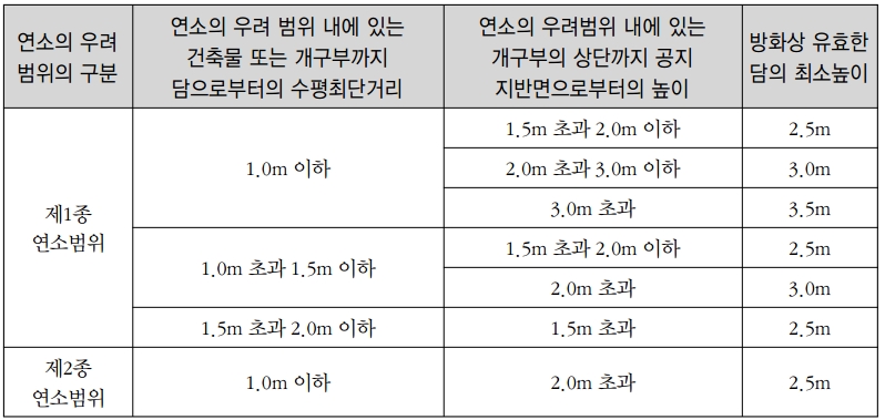연소의 우려범위 내에 있는 건축물의 부분과 대면하고 있는 담의 부분 및 당해 부분의 양단으로부터 제1종 연소범위에 있어서는 1m, 제2종 연소범위에 있어서는 0.5m를 연장한 부분까지를 상기 표에 따라 방화상 유효한 높이로 설치하여야 한다. 다만, 연소의 우려범위 내의 건축물이 내화구조(개구부에 방화문을 설치한 것을 포함)인 경우에는 그러하지 아니하다.