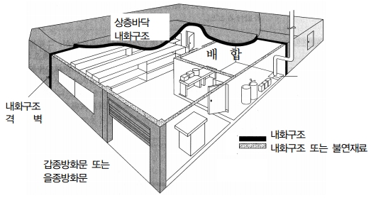 상층이 있는 경우에는 상층의 바닥을 내화구조로 하는 동시에 상층으로의 연소를 방지하기 위한 조치를 강구하고, 상층이 없는 경우에는 지붕을 내화구조로 해야 한다.