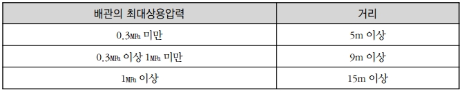 이송기지내에 위험물을 취급하는 시설(지하에 설치한 것 제외)은 이송기지의 부지 경계선으로부터 당해 배관의 최대상용압력에 따라 다음 표에 정한거리(국토의 계획 및 이용에 관한 법률에 의한 전용공업지역 또는 공업지역에 설치하는 경우 당해 거리의 3분의 1의 거리)를 두어야 한다.