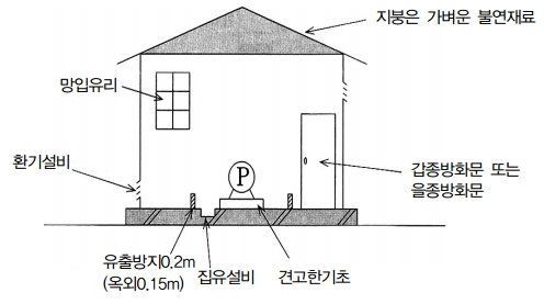 펌프를 설치하는 펌프실은 불연재료로 하고 지붕은 폭발력이 위로 방출될 정도의 가벼운 불연재료이어야 한다. 창 또는 출입구를 설치하는 경우 갑종방화문 또는 을종방화문으로 하고, 유리를 사용하는 경우에는 망입유리로 해야 한다. 바닥은 위험물이 침투하지 아니하는 구조로 하고 그 주변에 높이 20cm이상의 턱을 설치해야 한다. 또한 누설한 위험물이 외부로 유출되지 아니하도록 바닥은 적당한 경사를 두고 그 최저부에 집유설비를 설치해야 한다.