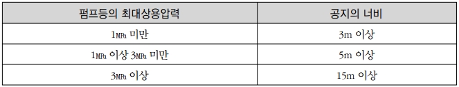 펌프 등 펌프를 펌프실 내에 설치한 경우에는 당해 펌프실을 말함 은 그 주위에 다음 표에 의한 공지를 보유해야 한다 다만 벽 기둥 및 보를 내화구조로 하고 지붕을 폭발력이 위로 방출될 정도의 가벼운 불연재료로 한 펌프실에 펌프를 설치한 경우에는 공지의 너비의 3분의 1로 할 수 있다.