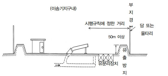 누출된 위험물이 부지 밖으로 유출되지 아니하도록 이송기지의 부지경계선에는 높이 50cm이상의 방유제를 설치하여야 한다.