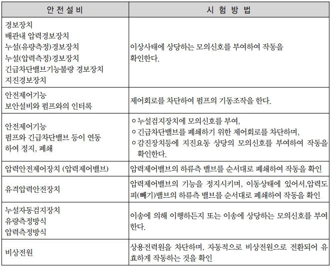 다음 표에 의한 안전설비는 시험을 실시하여 정상으로 작동하는 것이어야 한다.