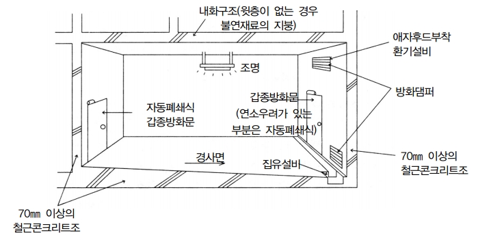 화재 등 사고발생시 확대를 방지하기 위해 일반취급소의 용도로 사용되는 부분은 다른 용도로 사용하는 부분과 완전 구획하여야 한다. 따라서 건축물중 일반취급소의 용도로 사용하는 부분은 벽·기둥·바닥 및 보를 내화구조로 하고, 출입 구 외의 개구부가 없는 두께 70mm이상의 철근콘크리트조 또는 이와 동등 이상의 강도가 있는 구조의 바닥 또는 벽으로 해야 하며, 상층이 있는 경우에 있어서는 상층의 바닥을 내화구조로 하고, 상층이 없는 경우에 있어서는 지붕을 불연재료로 해야 한다. 또한 창을 설치하지 말아야 하고 출입 구에는 갑종 방화문을 설치하되 연소의 우려가 있는 외벽 및 당해 부분외의 부분과의 격벽에 있는 출입구에는 수시로 열 수 있는 자동폐쇄식의 것으로 해야 한다.