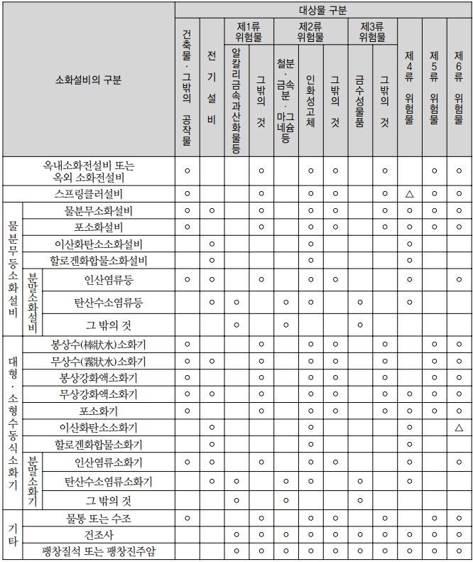 ① “ ◦ ” 표시는 당해 소방대상물 및 위험물에 대하여 소화설비가 적응성이 있음을 표시하고, “△”표시는 제4류 위험물을 저장 또는 취급하는 장소의 살수기준면적에 따라 스프링클러설비의 살수밀도가 다음 표에 정하는 기준 이상인 경우에는 당해 스프링클러설비가 제4류 위험물에 대하여 적응성이 있음을, 제6류 위험물을 저장 또는 취급하는 장소로서 폭발의 위험이 없는 장소에 한하여 이산화탄소소화기가 제6류 위험물에 대하여 적응성이 있음을 각각 표시한다.