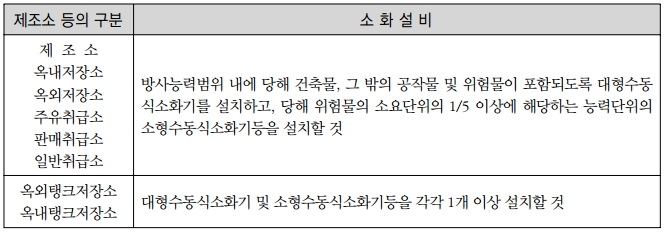 ① 위 표 오른쪽란의 소화설비를 설치함에 있어서는 당해 소화설비의 방사범위가 당해 제조소, 일반취급소, 옥내저장소, 옥외탱크저장소, 옥내탱크저장소, 옥외저장소, 암반탱크저장소(암반탱크에 관계되는 부분을 제외한다) 또는 이송취급소(이송기지 내에 한한다)의 건축물, 그 밖의 공작물 및 위험물을 포함하도록 하여야 한다. 다만, 고인화점위험물만을 100℃ 미만의 온도에서 취급하는 제조소 또는 일반취급소의 경우에는 당해 제조소 또는 일반취급소의 건축물 및 그 밖의 공작물만 포함하도록 할 수 있다.