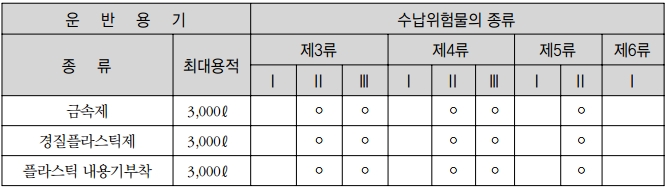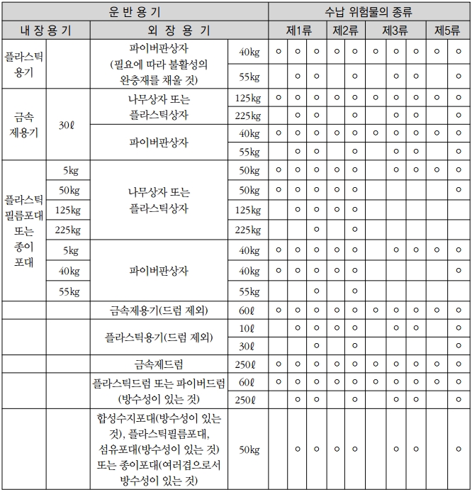 <비고> “ ◦ ”표시는 수납위험물의 종류별 각란에 정한 위험물에 대하여 당해 각란에 정한 운반
