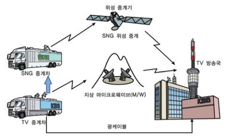 중계 방송의 경우 생방송(live)을 주로 실시하나 방송 시간 편성에 문제가 있을 경우 녹화 방송도 실시한다. 특히 긴급 뉴스인 경우 현장과 뉴스 스튜디오 간 STL-Link(Studio Transmitter Link)를 구성하여 생방송으로 송출되며 그림Ⅱ-74와 같이 위성, 무선, 유선 방식으로 구성된다.