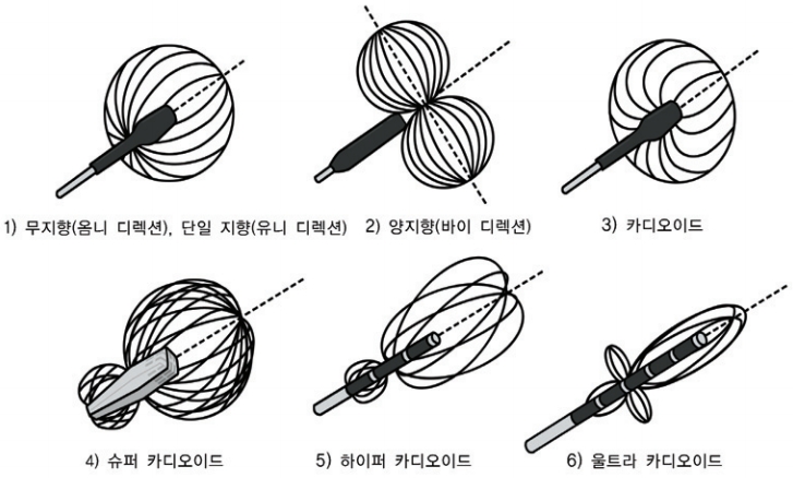 마이크는 음원의 입사 방향에 따라 감도와 음색이 변하며 정면축을 기준으로 360˘에 대한 주파수 반응을 나타낸다. 이와 같은 방향에 대한 마이크의 감응 특성을 지향성(polar pattern)이라고 한다. 지향 특성을 표시하는 동심원상의 원들은 수신 감도를 dB로 표시한 것인데 가장 바깥쪽의 원은 최대 감도를, 가장 안쪽의 원은 최소 감도를 나타낸다.