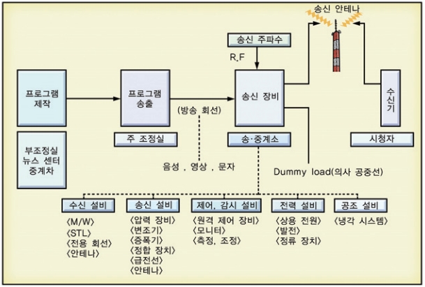 송신소는 그림<Fig06>과 같이 구성된다. STL 1, STL 2는 주조정실에서 송출한 프로그램을 수신하기 위한 M/W 장비이며, 오토 체인저에 의하여 전송로의 안정성이 보장되고 있으며, 송신기 또한 두 개로 구성되어 주송신기의 장애 발생 시 동축 스위치(coaxial switch)를 예비 송신기로 전환하면 장애 시간을 최소화하면서 송신 기능을 복구할 수 있다. 더미 로드는 송신기의 정비나 특성 측정 시 사용하는 것으로, 실제 안테나를 연결한 것 같은 기능을 하는 의사 부하이다. 각 장비에 공급하는 전원은 상용 전원 이외에, 무정전 장치 및 비상 발전기를 설치하여, 정전으로 인한 방송 사고의 예방에 만전을 기하고 있다.