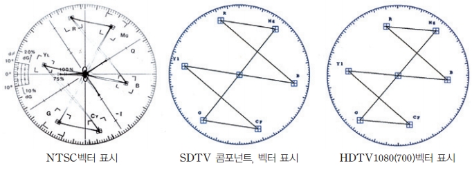 그러나 HD 방식에서는 Cb 신호를 가로축, 그리고 Cr 신호를 세로축으로 하여 평면적으로 표시한 것으로, 색상과 채도를 위상과 중심점에서의 길이(진폭)로 나타낸다.