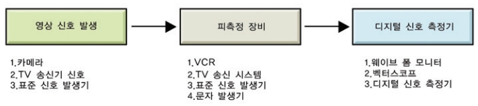 영상 신호 측정 장비 시스템은 테스트 신호 발생기, TV 화상 모니터, 파형 모니터(waveform monitor)와 위상 측정기(vector-scope), 디지털 TV 신호 분석기 등으로 구성되어 있다.