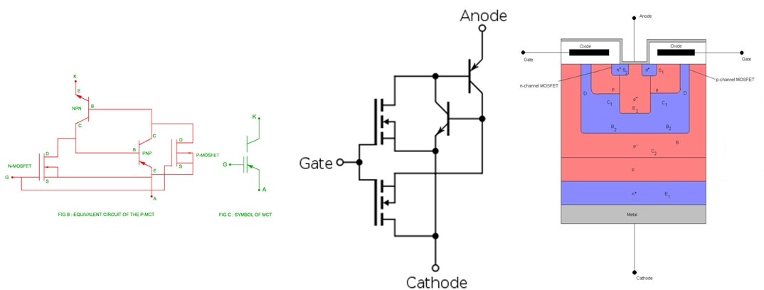 MOS 제어 사이리스터(MCT)는 MOSFET (금속-산화물-반도체 전계 효과 트랜지스터) 에 의해 제어 되는 전압 제어 완전 제어 가능 사이리스터 입니다. 이것은 1984년에 VAK Temple에 의해 발명되었으며 초기 절연 게이트 바이폴라 트랜지스터 (IGBT)와 기본적으로 유사했습니다. MCT는 작동이 GTO 사이리스터와 유사 하지만 전압 제어 절연 게이트가 있습니다. 그들은 등가 회로에 반대 전도성 유형의 두 MOSFET을 가지고 있습니다. 하나는 켜기를 담당하고 다른 하나는 끄기를 담당합니다. 켤 수만 있는 등가 회로에 하나의 MOSFET만 있는 사이리스터(일반 SCR과 같이 )를 사이리스터라고 합니다.MOS 게이트 사이리스터.