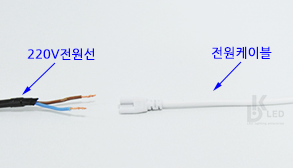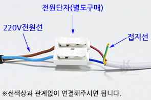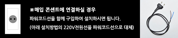 전원단자, 절연테이프, 와이어커넥터 등을 이용해 220V 전원선과 연결합니다.