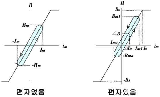 베이스의 구동 신호는 Tr1과 Tr2 모두 같은 시간폭으로 되어 있기 때문에, 예를 들어 Tr1의 tstg가 Tr2에 비교하여 길다고 하면 그림(Fig04)과 같이 상승분 △B가 하강분 -△B보다 큰 값이 된다. 그 때문에 자속 밀도는 스위칭의 1주기마다 (+)측으로 치우치고 마침내 Bm을 넘어 자기포화를 일으킨다. 이것을 편여자 현상이라고 한다.