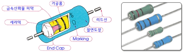 세라믹 로드에 금속산화물의 도전성 박막을 코팅하여 저항체를 형성하고 Cutting한 후 절연·보호도장을 하여 제조합니다. 소형으로 큰 전력용량의 저항기를 만들 수 있고 고온 안정성, 잡음, 주파수 특성도 우수한 저항입니다. 특히 열에 강하고 소형에 많은 전류를 흘릴 수 있어 전원 회로 등에 널리 사용됩니다.