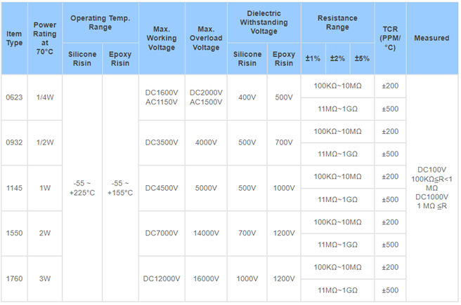 P: 5W~1KW, R: E24계열(1Ω~100KΩ) T: ±1%(F)~10%(K), TCR: ±25~500ppm/℃, 표시: 문자표시.